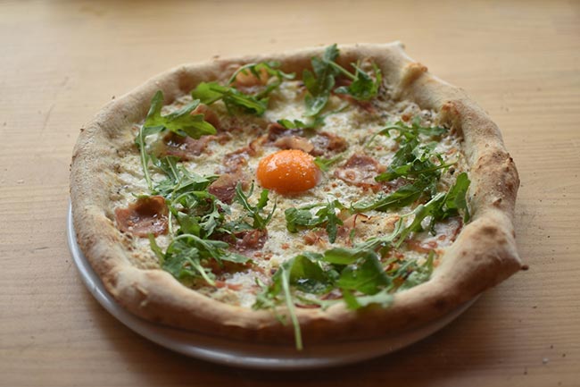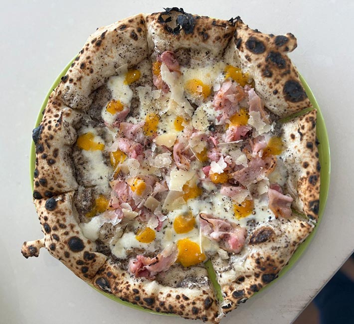 Base de trufa y mascarpone con mozzarella, panceta, huevo, salsa de trufa, AOVE, lascas de trufa, ralladura de limón, lascas de parmesano.